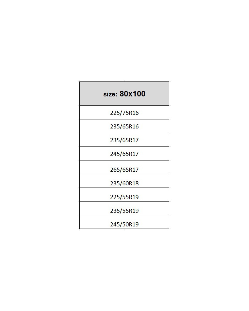 225/75R16, 235/65R16, 235/65R17, 245/65R17, 265/65R17, 235/60R18, 225/55R19, 235/55R19, 245/50R19.