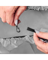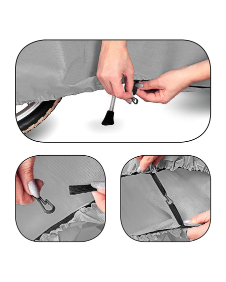 A huzatot a kép alapján, tiszta biciklire tegye fel. A készletben lévő horoggal a bicikli váza alatt kösse össze a huzat rögzítőkötelét.