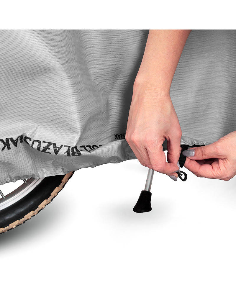 A huzatot a kép alapján, tiszta bicikli(k)re tegye fel. A készletben lévő horoggal a biciklik vázai alatt kösse össze a huzat rögzítőkötelét.