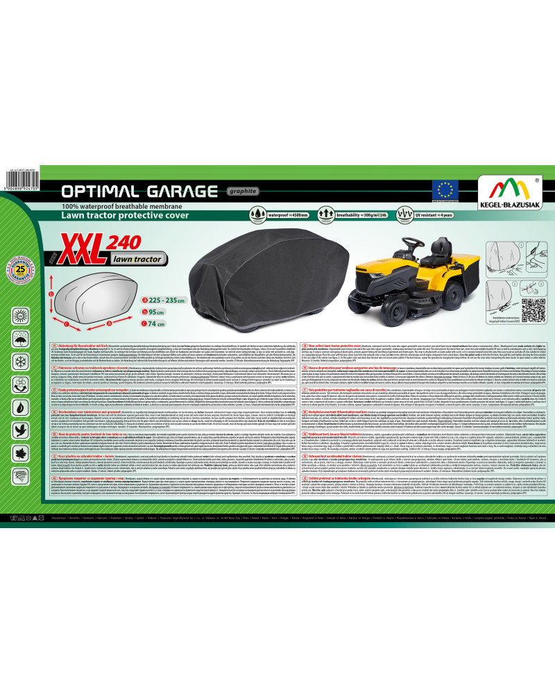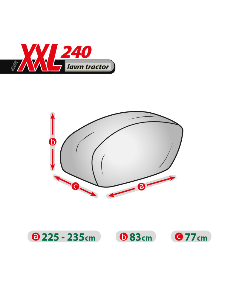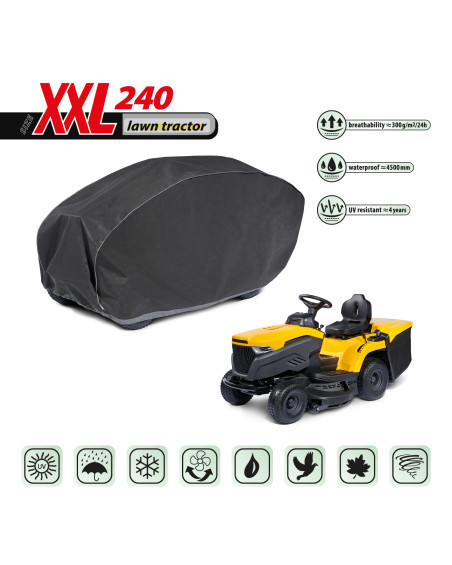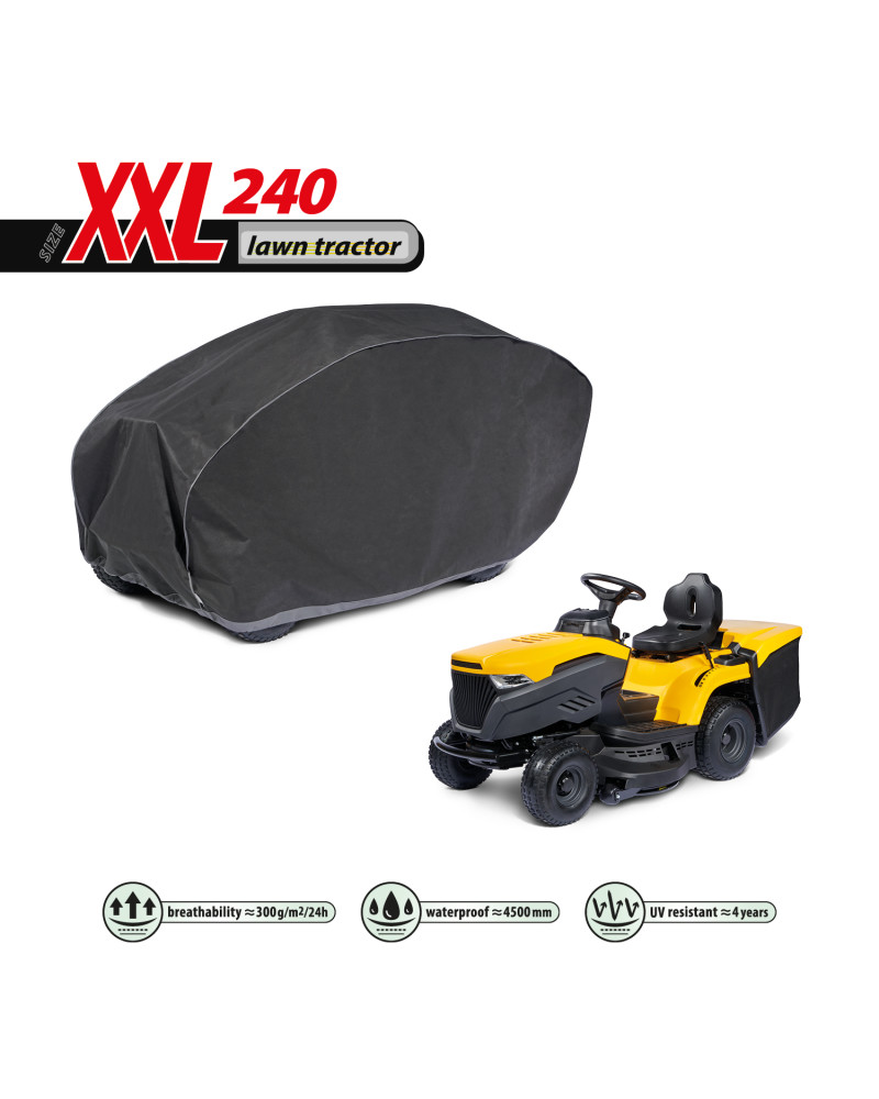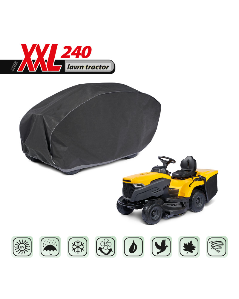 Egész évben használható védőhuzat a szabadban tárolt benzines kerti fűnyíró traktor védelmére a környezet káros hatásaival szemben. Különleges kialakításának köszönhetően eső esetén a víz lefolyik a fedeléről anélkül, hogy behatolna a huzat alá, a vízpára pedig kifelé távozik. Védi a traktort az eső, a hó, a fagy és a napfény (káros UV-sugarak), valamint a szennyeződések, például a por, a madárürülék és a fanedvek ellen. Csökkenti a korróziót és a műanyag alkatrészek öregedését, valamint védi a lakkozott és krómozott elemeket a kifakulás és mattá válással szemben. A huzat teljes mértékben ellenálló minden időjárási körülménnyel szemben