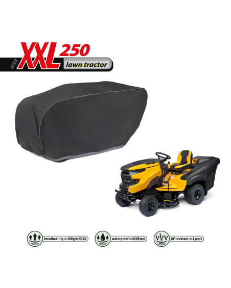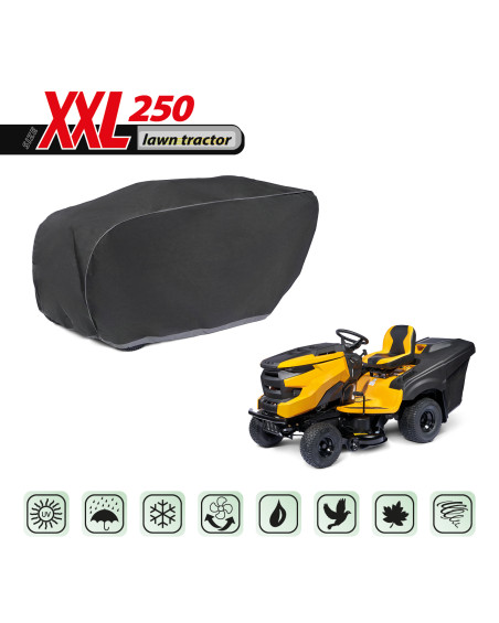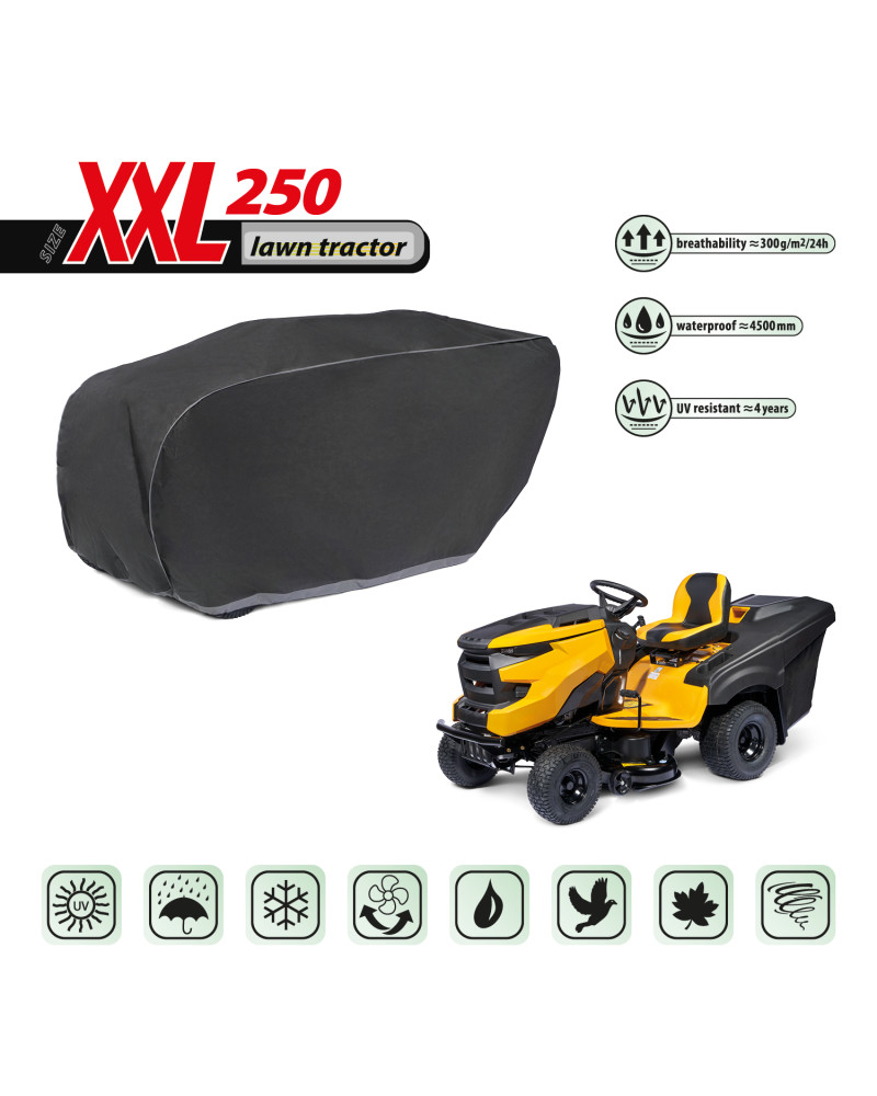 Egész évben használható védőhuzat a szabadban tárolt benzines kerti fűnyíró traktor védelmére a környezet káros hatásaival szemben. Különleges kialakításának köszönhetően eső esetén a víz lefolyik a fedeléről anélkül, hogy behatolna a huzat alá, a vízpára pedig kifelé távozik. Védi a traktort az eső, a hó, a fagy és a napfény (káros UV-sugarak), valamint a szennyeződések, például a por, a madárürülék és a fanedvek ellen. Csökkenti a korróziót és a műanyag alkatrészek öregedését, valamint védi a lakkozott és krómozott elemeket a kifakulás és mattá válással szemben. A huzat teljes mértékben ellenálló minden időjárási körülménnyel szemben
