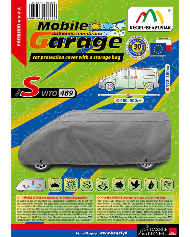 A magas minőségű, autókra való MOBILE GARAGE huzatok vízhatlanok, de páraáteresztőek. A huzat négyrétegű, vízhatlan, páraáteresztő membránból és nehezen vizesedő, de magas páraáteresztő képességgel rendelkező anyagokból készült, majdnem teljesen szoros, de ugyanakkor elvezeti a huzat alatt összegyűlő nedvet. Az egész kocsit, az alsó részével együtt védi a kedvezőtlen környezeti hatásoktól. A huzatok UV-sugárzás ellenállóak. A rögzítésük kocsit körbefogó zsinórral történik, megfelelően összekötve biztosítják a kocsit erős szél esetében is. Mivel az ajánlatunkban több alakban és méretben találhatóak, különböző kocsikhoz illenek. A 30 hónapra szóló garanciának köszönhetően biztos lehet abban, hogy a legmagasabb minőségű terméket vásárolja.
