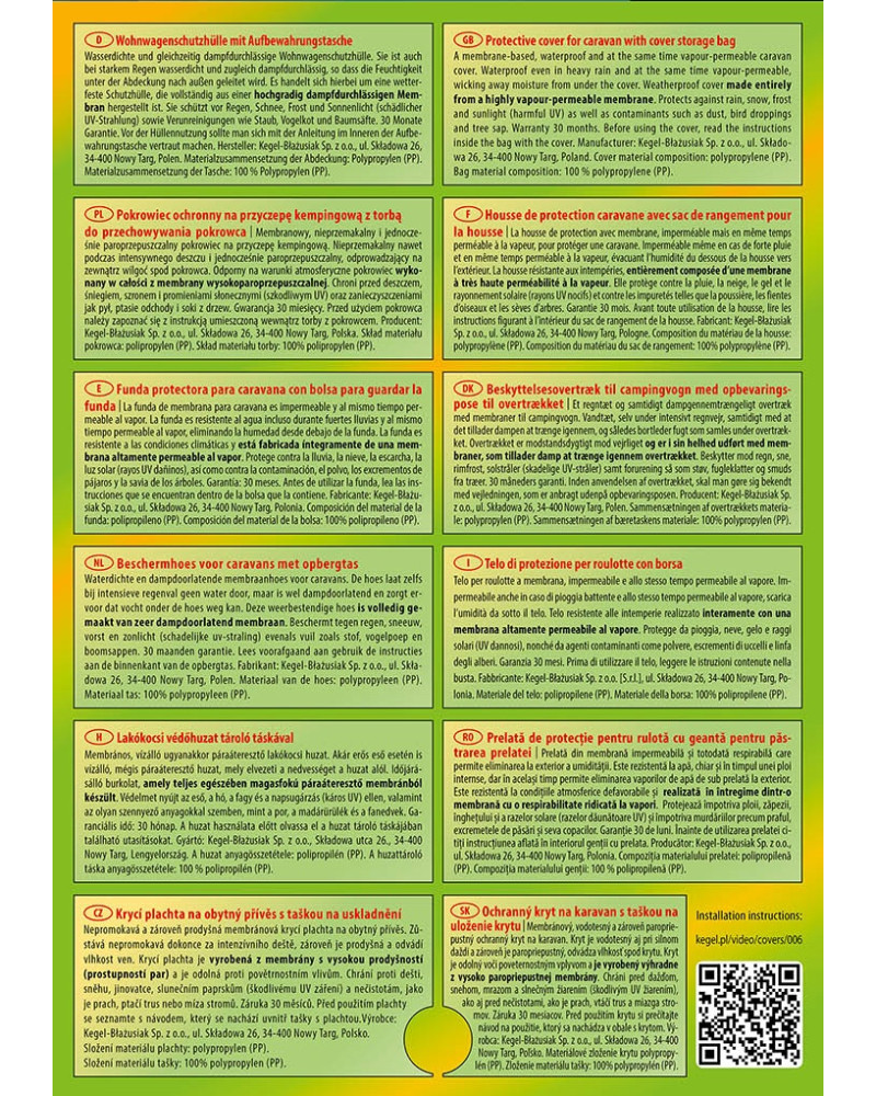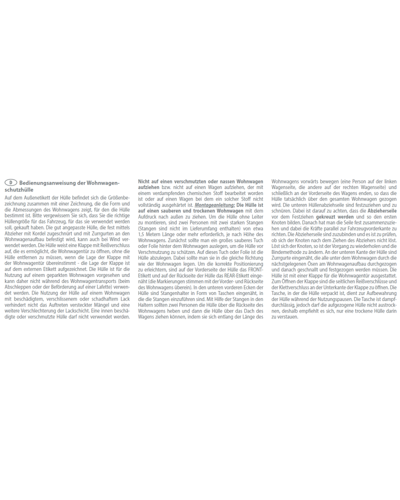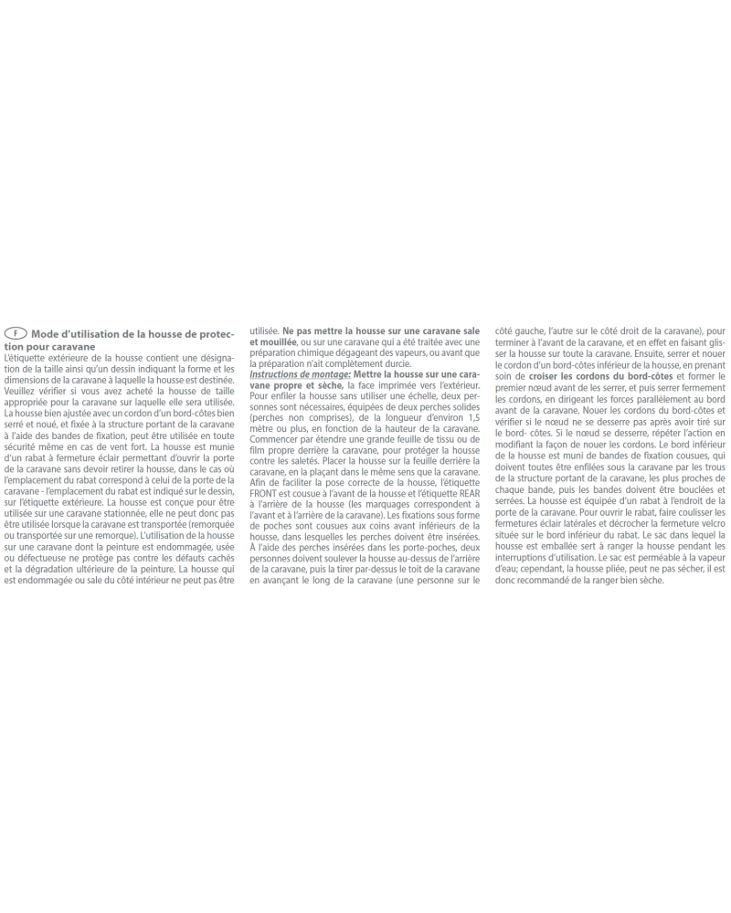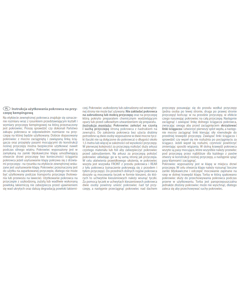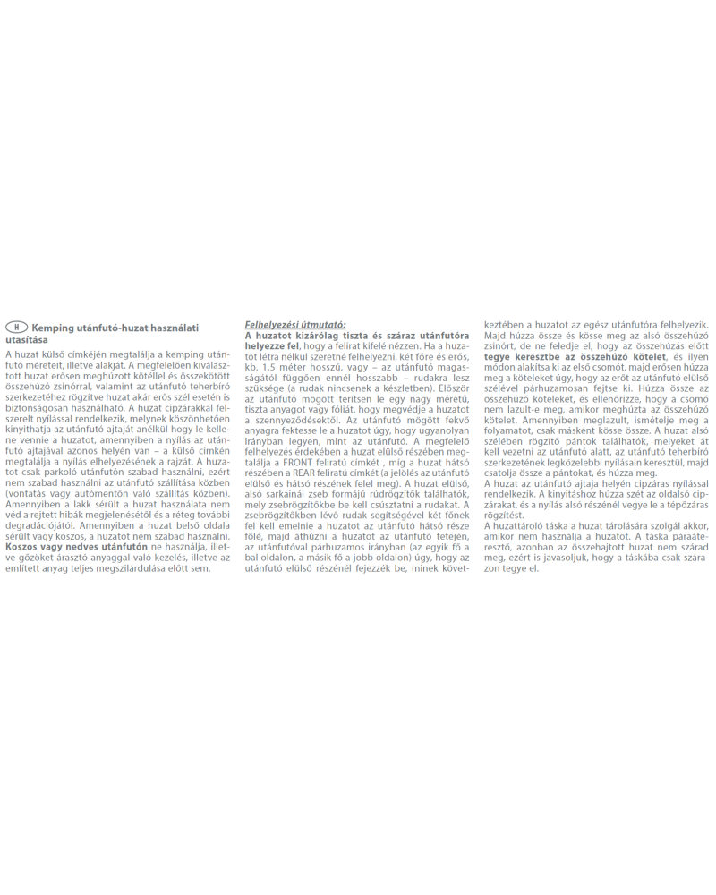 A huzatot kizárólag tiszta és száraz utánfutóra helyezze fel, a fehér oldalával befelé (felirattal kifelé). Ha a huzatot létra nélkül szeretné felhelyezni, két főre és erős, kb. 1,5 méter hosszú, vagy – az utánfutó magasságától függően ennél hosszabb – rudakra lesz szüksége (a rudak nincsenek a készletben). Először az utánfutó mögött terítsen le egy nagy méretű, tiszta anyagot vagy fóliát, hogy megvédje a huzatot a szennyeződésektől. Az utánfutó mögött fekvő anyagra fektesse le a huzatot úgy, hogy ugyanolyan irányban legyen, mint az utánfutó. A megfelelő felhelyezés érdekében a huzat elülső részében megtalálja a FRONT feliratú címkét , míg a huzat hátsó részében a REAR feliratú címkét (a jelölés az utánfutó elülső és hátsó részének felel meg). A huzat elülső, alsó sarkainál zseb formájú rúdrögzítők találhatók, mely zsebrögzítőkbe be kell csúsztatni a rudakat. A zsebrögzítőkben lévő rudak segítségével két főnek fel kell emelnie a huzatot az utánfutó hátsó része fölé, majd áthúzni a huzatot az utánfutó tetején, az utánfutóval párhuzamos irányban (az egyik fő a bal oldalon, a másik fő a jobb oldalon) úgy, hogy az utánfutó elülső részénél fejezzék be, minek következtében a huzatot az egész utánfutóra felhelyezik. Majd húzza össze és kösse meg az alsó összehúzó zsinórt, de ne feledje el, hogy az összehúzás előtt tegye keresztbe az összehúzó kötelet,és ilyen módon alakítsa ki az első csomót, majd erősen húzza meg a köteleket úgy, hogy az erőt az utánfutó elülső szélével párhuzamosan fejtse ki. Húzza össze az összehúzó köteleket, és ellenőrizze, hogy a csomó nem lazult-e meg, amikor meghúzta az összehúzó kötelet. Amennyiben meglazult, ismételje meg a folyamatot, csak másként kösse össze. A huzat alsó szélében rögzítő pántok találhatók, melyeket át kell vezetni az utánfutó alatt, az utánfutó teherbíró szerkezetének legközelebbi nyílásain keresztül, majd csatolja össze a pántokat, és húzza meg.