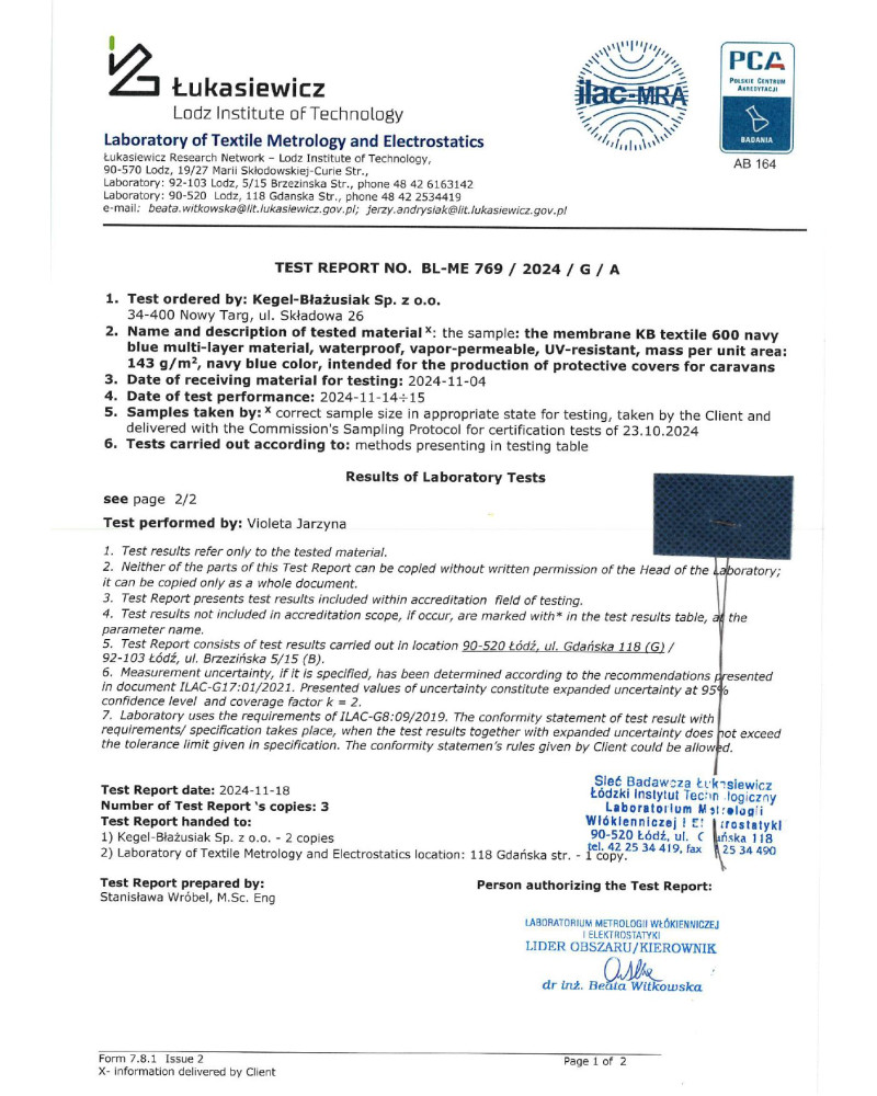 Egy autótakaró ponyva tartósságát a nap UV sugárzásával, a magas hőmérséklettel, esővel, faggyal, hóval és a használatból eredő szennyeződésekkel szemben tanúsított ellenállása határozza meg. Szakértőink többéves saját tesztelési tapasztalat alapján, illetve a PN-EN ISO 4892-3 kutatási szabványok alapján kidolgozták az anyagok környezeti hatásokkal szemben tanúsított tartósságának hatékony tesztelési módszereit. Az USA Atlas UV teszt-kamrában alapos vizsgálaton esik át minden egyes szállítani kívánt anyag, melyekből a Kegel-Błażusiak ponyvák készülnek. A gyártás során felhasznált anyagok szigorú minőségellenőrzésére hagyatkozva tehát akár intenzív használat mellett is garantáljuk az autótakaró ponyvák tartósságát .