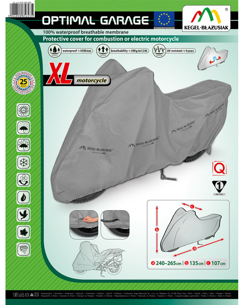 Membrános, vízálló, ugyanakkor páraáteresztő védőhuzat, mely védelmet nyújt a belsőégésű vagy elektromos motorkerékpárjának a káros környezeti hatásokkal szemben. Ez az időjárásálló védőhuzat teljes mértékben páraáteresztő membránból készült. Még erős eső esetén is vízálló, ugyanakkor páraáteresztő, a nedvességet pedig elvezeti a huzat alól. Védelmet nyújt az eső, a hó, a fagy és a napsugarak (káros UV-sugárzás) káros hatásaival szemben, valamint az olyan szennyező anyagokkal szemben is, mint például a por, a madárürülék vagy a fanedvek. Csökkenti a korróziót és a műanyag alkatrészek öregedését, véd a festék és a krómozott alkatrészek kifakulása és elszíneződése ellen. Használható belső égésű motorkerékpár hosszú vagy rövid távú kültéri tárolására, illetve elektromos motorkerékpár rövid távú tárolására. Beltéri használatra is alkalmas. Az összehúzó kötél és a motorkerékpár alatti rögzítőelemek biztosítják, hogy a szél ne tépje le a huzatot. A védőhuzatban lévő nyílásoknak köszönhetően a motorkerékpárt a huzattal együtt rögzítheti, az első keréknél fogva, egy zár vagy lánc segítségével.
