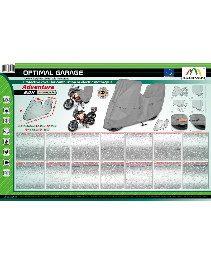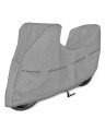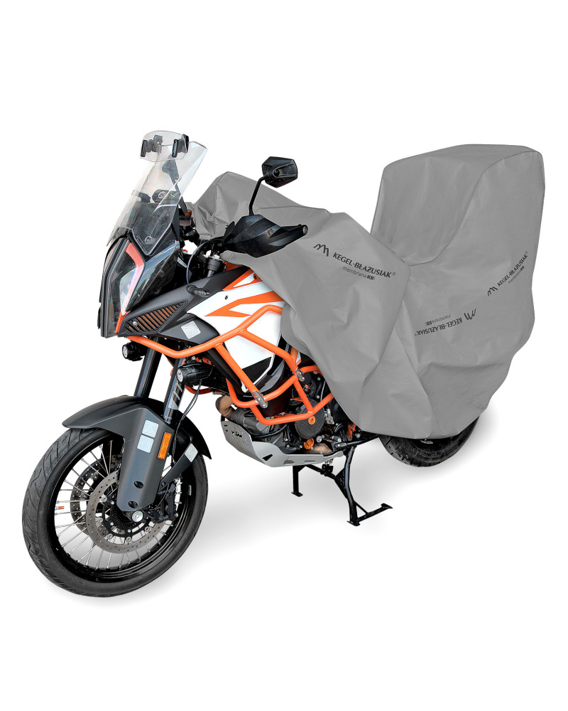 Membrános, vízálló, ugyanakkor páraáteresztő védőhuzat, mely védelmet nyújt a belsőégésű vagy elektromos motorkerékpárjának a káros környezeti hatásokkal szemben. Ez az időjárásálló védőhuzat teljes mértékben páraáteresztő membránból készült. Még erős eső esetén is vízálló, ugyanakkor páraáteresztő, a nedvességet pedig elvezeti a huzat alól. Védelmet nyújt az eső, a hó, a fagy és a napsugarak (káros UV-sugárzás) káros hatásaival szemben, valamint az olyan szennyező anyagokkal szemben is, mint például a por, a madárürülék vagy a fanedvek. Csökkenti a korróziót és a műanyag alkatrészek öregedését, véd a festék és a krómozott alkatrészek kifakulása és elszíneződése ellen. Használható belső égésű motorkerékpár hosszú vagy rövid távú kültéri tárolására, illetve elektromos motorkerékpár rövid távú tárolására. Beltéri használatra is alkalmas. Az összehúzó kötél és a motorkerékpár alatti rögzítőelemek biztosítják, hogy a szél ne tépje le a huzatot. A védőhuzatban lévő nyílásoknak köszönhetően a motorkerékpárt a huzattal együtt rögzítheti, az első keréknél fogva, egy zár vagy lánc segítségével.