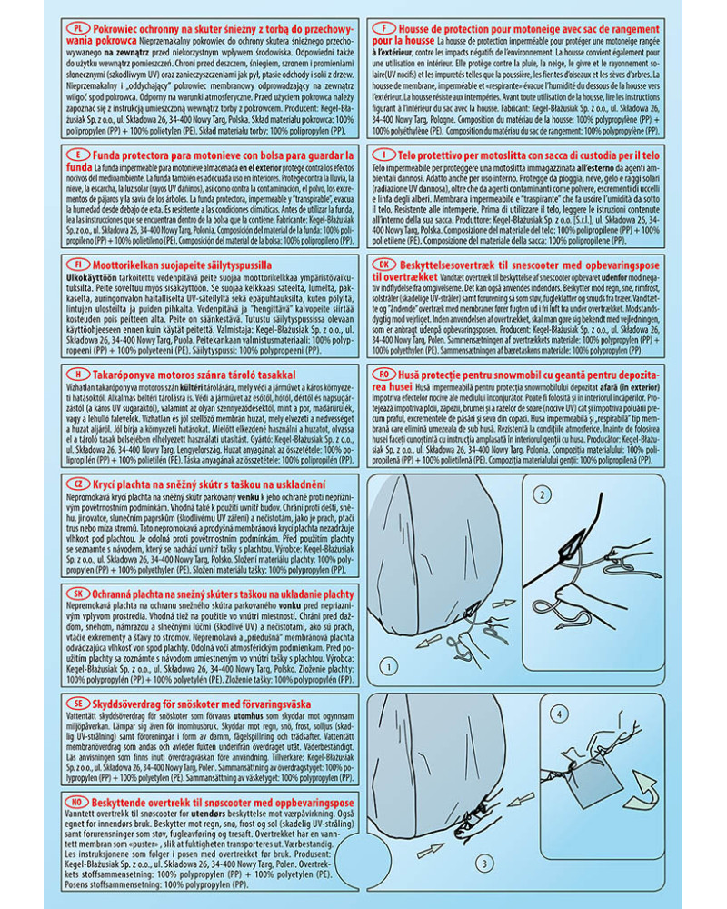 A rögzítő zsinórokat tegye keresztbe és erősen húzza meg a jármű hátsó szélével párhuzamosan (lásd 2. sz. rajz a huzat belső címkéjén). Kösse össze az összehúzó köteleket, majd ellenőrizze le, hogy a csomó az összehúzás után nem lazul-e meg. Amennyiben a csomó meglazul, ismételje meg, de változtasson az összekötés módján. A huzat alsó szegélyében rögzítőpántok találhatók, ezek mindegyikét vezesse át a motoros szán alatt, majd kösse össze rögzítő kapcsokkal és húzza meg.