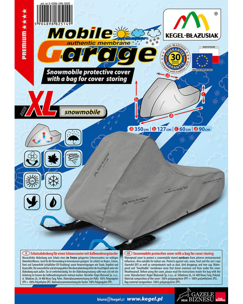 A magas minőségű, autókra való MOBILE GARAGE huzatok vízhatlanok, de páraáteresztőek. A huzat háromrétegű, vízhatlan, páraáteresztő membránból és nehezen vizesedő, de magas páraáteresztő képességgel rendelkező anyagokból készült, majdnem teljesen szoros, de ugyanakkor elvezeti a huzat alatt összegyűlő nedvet. Az egész kocsit, az alsó részével együtt védi a kedvezőtlen környezeti hatásoktól. A huzatok UV-sugárzás ellenállóak. A rögzítésük kocsit körbefogó zsinórral történik, megfelelően összekötve biztosítják a kocsit erős szél esetében is. Mivel az ajánlatunkban több alakban és méretben találhatóak, különböző kocsikhoz illenek. A 30 hónapra szóló garanciának köszönhetően biztos lehet abban, hogy a legmagasabb minőségű terméket vásárolja.
