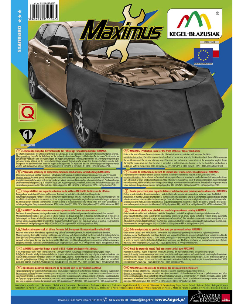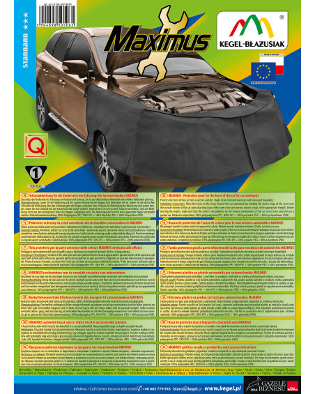 A MAXIMUS II védőhuzatot az autószerelőkre és az autószervizek dolgozóira gondolván terveztük meg, azért, hogy védje a szervizelt kocsi elemeit és oldalait a karcolásoktól és szennyeződésektől, illetve hogy biztosítsa a szerelők munkájának komfortját. Védi az egész részt a motor kamrája körül, illetve a szervizelt kocsi oldalait, minek köszönhetően a szerviz alkalmazottja nyugodtan javíthatja az autót anélkül, hogy aggódna, hogy meg fogja sérteni a karosszériát. A huzat vizet nehezen áteresztő és olajálló SPUNBOND szövetből készült – ez az anyag biztosítja a kocsi kiváló védelmét. A huzat belső oldalán lévő finom szövet nem karcolja össze a karosszériát. Környezetbarát termék, többször használható. Univerzális méretben készült – alkalmazható a kocsi minden modelljénél. Könnyen feltehető – csúszásgátló anyaggal rögzül, minek köszönhetően majdnem önmagától tapad a szervizelt kocsihoz. Plusz gumikkal rendelkezik, ezzel rögzíthető a tükrökhöz, a nagyobb biztonság érdekében.