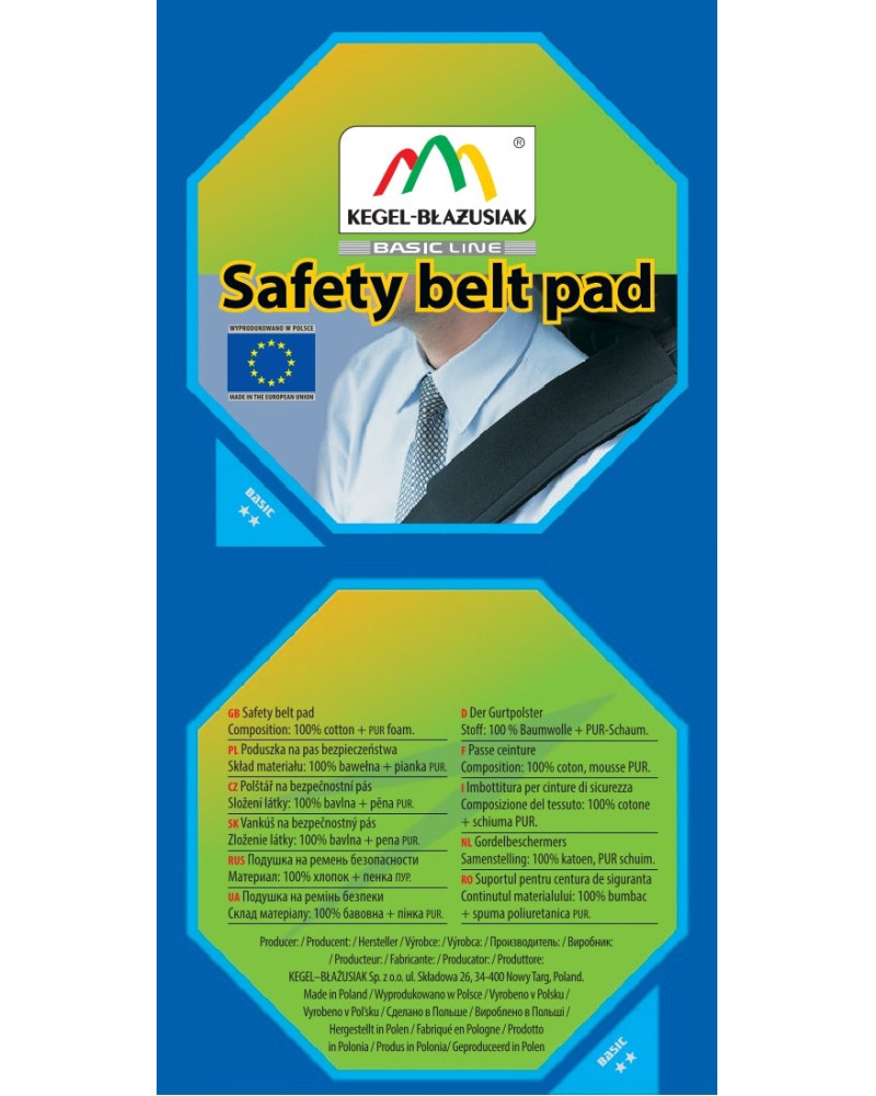 A szerelés nagyon könnyű – a párnát tépőzárakkal kell rögzíteni a biztonsági övekhez. Határozottan növeli az utazás komfortját, mivel a segítségével a biztonsági öv nem nyomja a testet. A párna funkcionalitását elsősorban azok fogják értékelni, akik hosszú utazás előtt állnak. Kellemes anyaga miatt, mely nagyon finom tapintású a bőrnek, és nagyon puha PUR habból készült kitöltés miatt a párna nagyon kényelmes – rá lehet hajtani a fejet, és ez megkönnyíti az elalvást. A gyerekei el lesznek ragadtatva. A párna pamutból készült, több színváltozatban (kékben, pirosban, zöldben, szürkében és sárgában) kapható. A színek mélyek és intenzívek, nem rikítóak, inkább kissé visszafogadtak. A SAFETY BELT PAD egy ötletes, olcsó kiegészítő, mely ki fogja egészíteni a kocsi belső terét. A termék nagyon könnyen tisztítható - nyugodtan lehet mosni 40 fokon. A termék a nagyon ismert és kiválóra értékelt Kegel-Błażusiak cégtől származik, mely autóhuzatokat és munkaruházatot állít elő. Lengyelországban gyártjuk, főleg lengyel anyagokból, megtartva az Európai Unió minőségi sztenderjét. A több éves tapasztalat és az egyre jobb kínálat miatt e márka termékei a legjobbnak nevezhetők Lengyelországban.