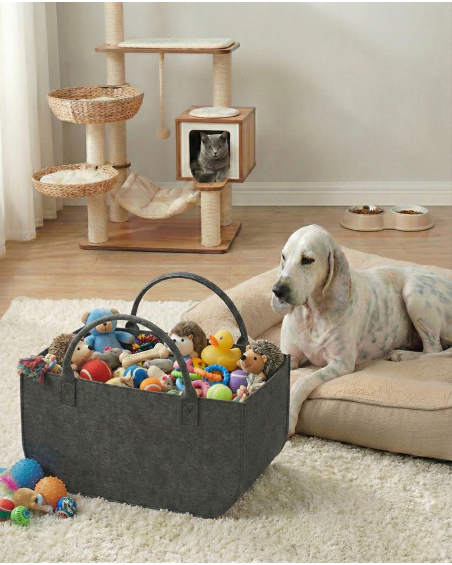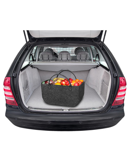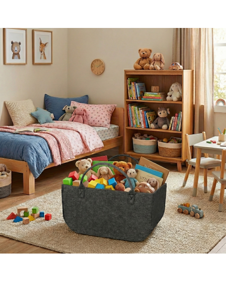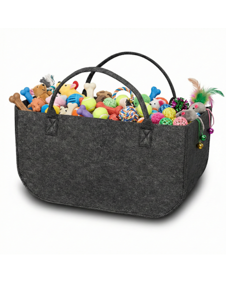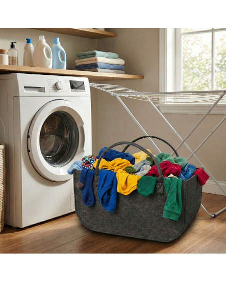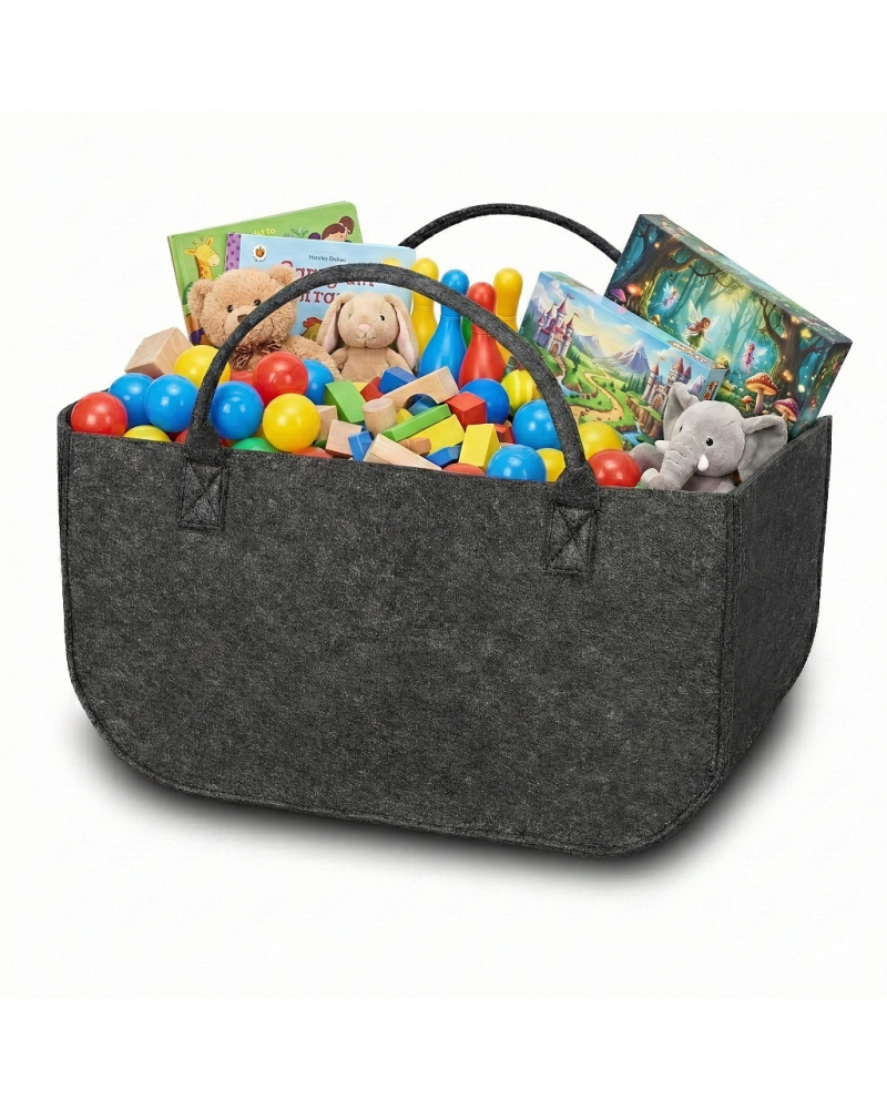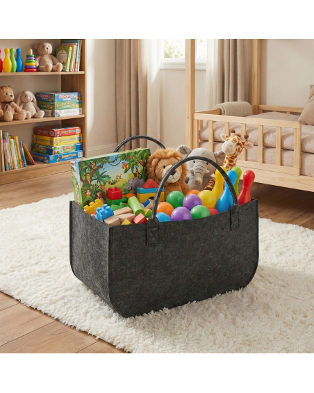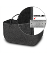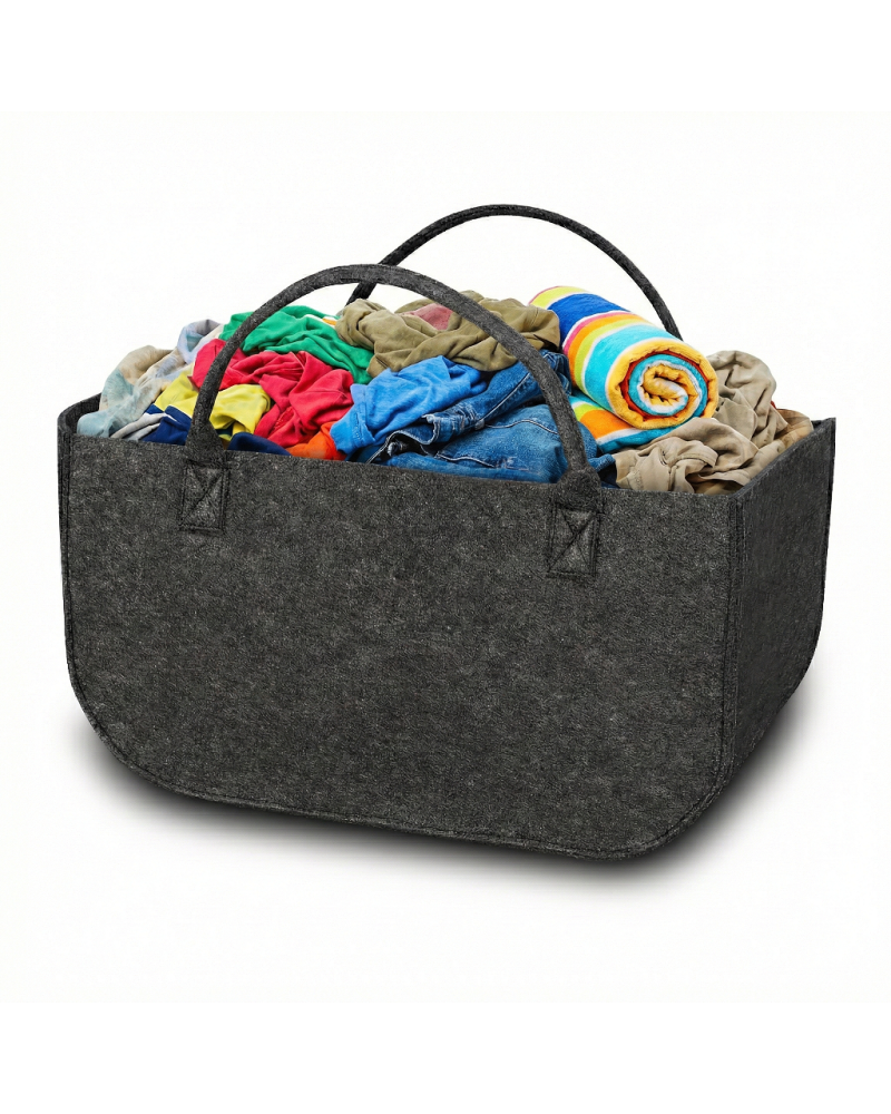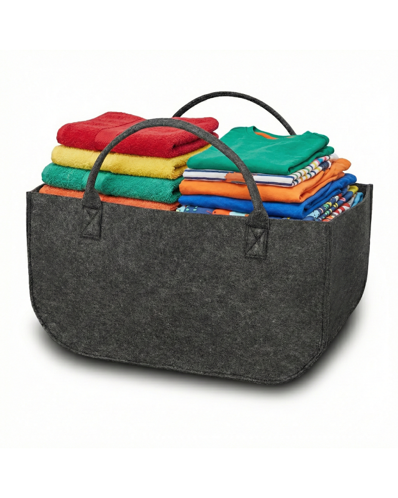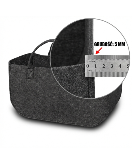 Nagy méretű táska sokféle felhasználásra, pl. otthon tűzifa, gyermekjátékok, kutyus- és cicajátékok, szennyes ruhák tárolására és szállítására, valamint sok más célra. A táska ideális bevásárláshoz is, autóval való szállításhoz és a bevásárlás autóból a házba való szállításához. A táska nagyon erős, 5 mm vastag filcből készült, amelyet nagyon erős magszálakkal varrtak össze, így a táska nagyon erős és mindig „megtartja az alakját”, a táskára varrt fogantyúk pedig vastagok, erősek és kényelmesek. A táska akár 30 kg súlyú terhet is elbír.