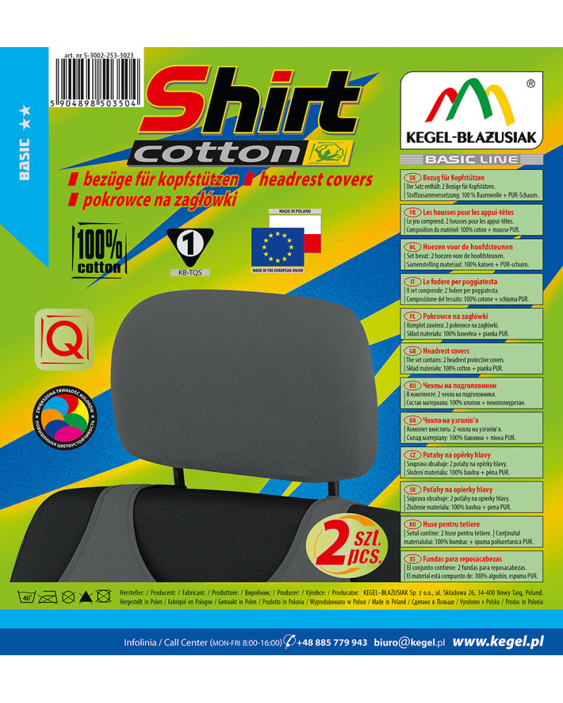 A fejtámlákra való COTTON huzatok kiegészítik a sorozatot, és kiegészítik a SHIRT COTTON póló sorozatot, melyben megtalálhatóak az elülső ülésekre és a hátsó díványra való huzatok a személygépkocsik számára, illetve a szállítókocsik számára az elülső fotelre és a hátsó kétszemélyes díványra. A fejtámlára való huzatok elemeit külön értékesítjük, ezért külön megvehetik, és összegyűjthetik az egész készletet.