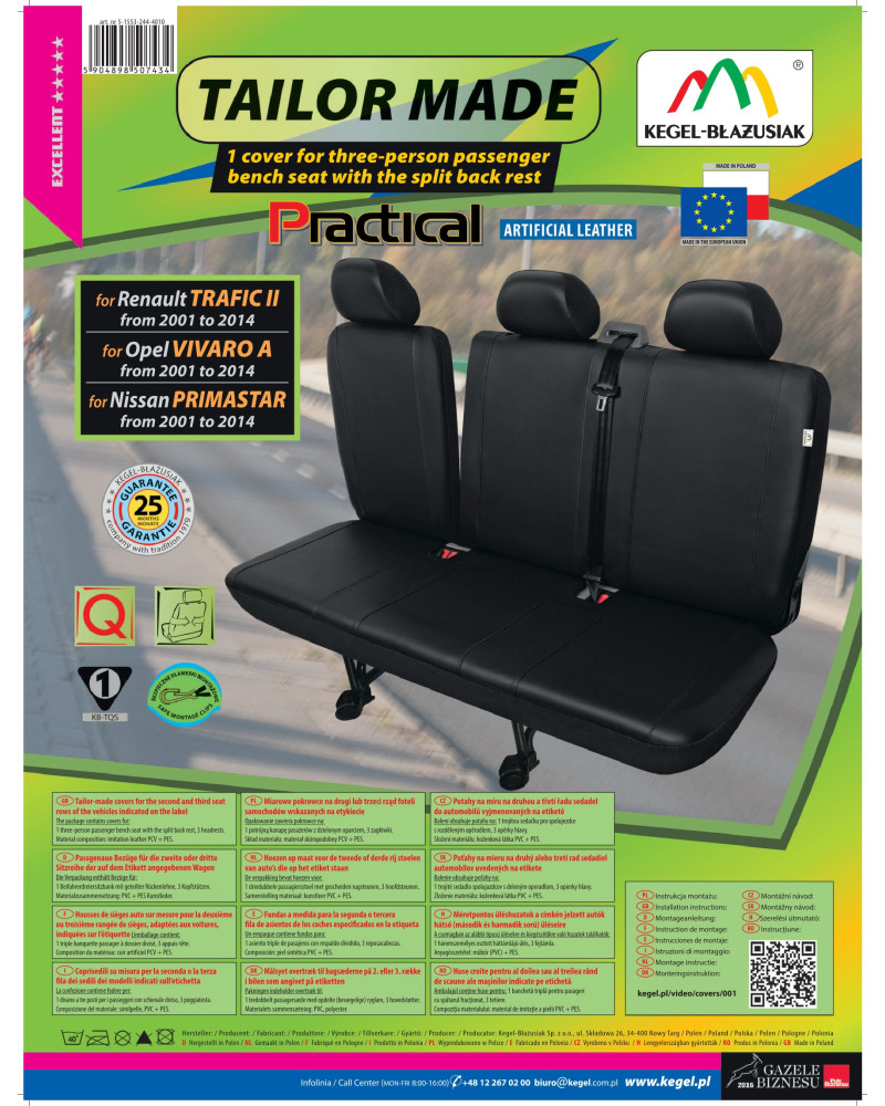 A PRACTICAL méretezett huzat kivételesen tartós, újgerenációs műbőrből készült, ami a legapróbb részletek gondos kivitelezésével az ügyfelek legmagasabb elvárásainak felel meg. A megfelelően felhúzott huzatokat alig lehet elkülöníteni az eredeti, bőrből készült kárpittól, az eredmény pedig nagyon alacsony áron elérhető. A huzat erős, tartós anyagból készült, a megfelelő keretnek köszönhetően jól igazodik az ülésekhez, és jól tapad hozzájuk, így elkerülhető a huzat elcsúszása. A RACTICAL autóhuzatok nagyon jól védik az eredeti kárpitot a koszolódástól és a kopástól, az ízléses , modern stílus pedig pozitív esztétikai benyomást kelt. A huzatot nagyon könnyű tiszítani és feltenni. Alapos kivitelezés garantálja a magas minőséget és a hosszú ideig tartó használatot. A vízhatlan, nem koszolódó és kivételesen tartós anyag biztosítja a praktikus használatot. Az ajánlatunk a szállításra használt kocsik és kisbuszok részére készült, azon vezetők számára, akik szeretnék megvédeni a kocsik belsejét, és elegánsabbá is tennék azt. A fekete, univerzális színek tökéletesen igazodnak a kocsik belsejéhez. A huzatok nagyon jól néznek ki mindegyik kocsi belsejében. Kivételesen elegánsak, ezért használatukkal minden belső tér elegánsabbá válik.