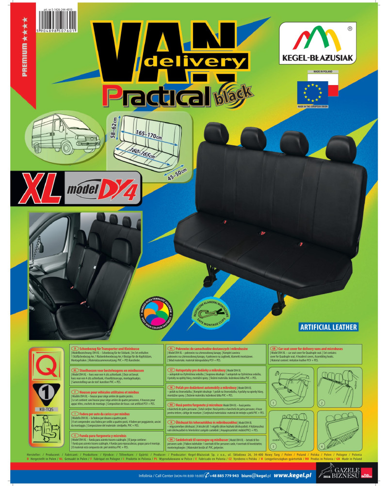 A PRACTICAL méretezett huzat kivételesen tartós, újgerenációs műbőrből készült, ami a legapróbb részletek gondos kivitelezésével az ügyfelek legmagasabb elvárásainak felel meg. A megfelelően felhúzott huzatokat alig lehet elkülöníteni az eredeti, bőrből készült kárpittól, az eredmény pedig nagyon alacsony áron elérhető. A huzat erős, tartós anyagból készült, a megfelelő keretnek köszönhetően jól igazodik az ülésekhez, és jól tapad hozzájuk, így elkerülhető a huzat elcsúszása. A RACTICAL autóhuzatok nagyon jól védik az eredeti kárpitot a koszolódástól és a kopástól, az ízléses , modern stílus pedig pozitív esztétikai benyomást kelt. A huzatot nagyon könnyű tiszítani és feltenni. Alapos kivitelezés garantálja a magas minőséget és a hosszú ideig tartó használatot. A vízhatlan, nem koszolódó és kivételesen tartós anyag biztosítja a praktikus használatot. Az ajánlatunk a szállításra használt kocsik és kisbuszok részére készült, azon vezetők számára, akik szeretnék megvédeni a kocsik belsejét, és elegánsabbá is tennék azt. A fekete, univerzális színek tökéletesen igazodnak a kocsik belsejéhez. A huzatok nagyon jól néznek ki mindegyik kocsi belsejében. Kivételesen elegánsak, ezért használatukkal minden belső tér elegánsabbá válik.