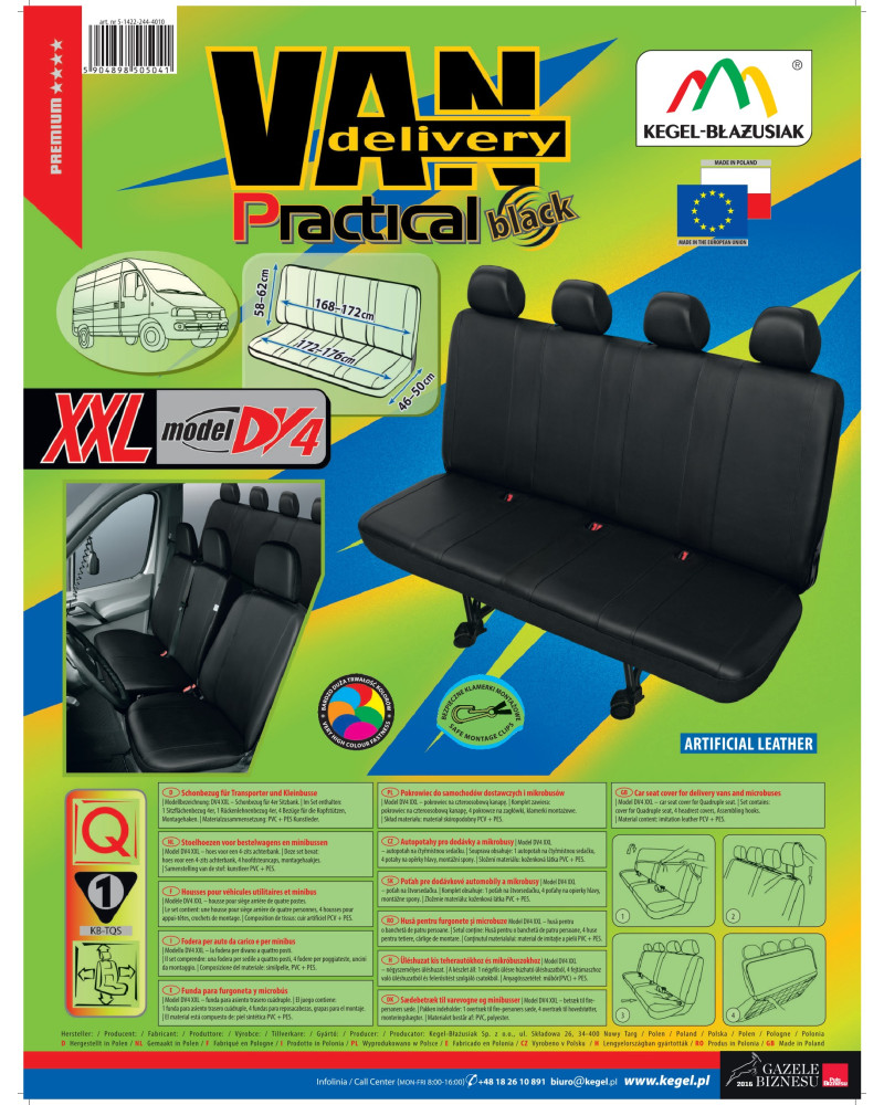 A PRACTICAL méretezett huzat kivételesen tartós, újgerenációs műbőrből készült, ami a legapróbb részletek gondos kivitelezésével az ügyfelek legmagasabb elvárásainak felel meg. A megfelelően felhúzott huzatokat alig lehet elkülöníteni az eredeti, bőrből készült kárpittól, az eredmény pedig nagyon alacsony áron elérhető. A huzat erős, tartós anyagból készült, a megfelelő keretnek köszönhetően jól igazodik az ülésekhez, és jól tapad hozzájuk, így elkerülhető a huzat elcsúszása. A RACTICAL autóhuzatok nagyon jól védik az eredeti kárpitot a koszolódástól és a kopástól, az ízléses , modern stílus pedig pozitív esztétikai benyomást kelt. A huzatot nagyon könnyű tiszítani és feltenni. Alapos kivitelezés garantálja a magas minőséget és a hosszú ideig tartó használatot. A vízhatlan, nem koszolódó és kivételesen tartós anyag biztosítja a praktikus használatot. Az ajánlatunk a szállításra használt kocsik és kisbuszok részére készült, azon vezetők számára, akik szeretnék megvédeni a kocsik belsejét, és elegánsabbá is tennék azt. A fekete, univerzális színek tökéletesen igazodnak a kocsik belsejéhez. A huzatok nagyon jól néznek ki mindegyik kocsi belsejében. Kivételesen elegánsak, ezért használatukkal minden belső tér elegánsabbá válik.