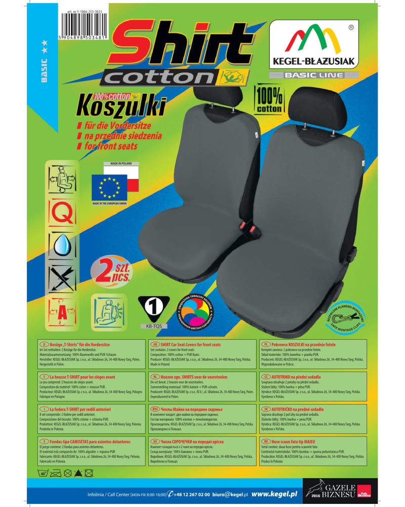 A COTTON pólós huzatok magas minőségű természetes anyagból (100% pamut) készültek, ami a legapróbb részletek gondos kivitelezésével együtt, meg fog felelni a legmagasabb elvárásoknak is. A megfelelő szerkezetüknek köszönhetően, és az újszerű felépítés révén a huzatok nagyon jól igazodnak a kocsi üléseihez, jól tapadnak hozzájuk, az egész anyag belső oldalán való PUR hab lamináció megakadályozza azt, hogy elcsússzanak a felületen. Letakarják a fotel/dívány egész használati területét, minek köszönhetően jól védik a károktól és a szennyeződésektől. Nem takarják le a fotelek oldalait, ennek köszönhetően biztonságosan használhatók az Air Bag légpárnákkal rendelkező fotelek esetén. A huzatok védenek, és ugyanakkor nagyon látható módon változtatják meg a fotelek kinézetét, a belső térnek egyedülálló karaktert biztosítva. A SHIRT COTTON huzatok megfelelnek az összes használati szabványnak, mivel nagyon jól védik a kocsi eredeti kárpitját a kopástól, a károktól, a szennyeződéstől.