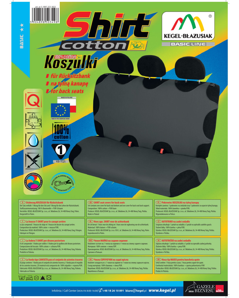 A COTTON pólós huzatok magas minőségű természetes anyagból (100% pamut) készültek, ami a legapróbb részletek gondos kivitelezésével együtt, meg fog felelni a legmagasabb elvárásoknak is. A megfelelő szerkezetüknek köszönhetően, és az újszerű felépítés révén a huzatok nagyon jól igazodnak a kocsi üléseihez, jól tapadnak hozzájuk, az egész anyag belső oldalán való PUR hab lamináció megakadályozza azt, hogy elcsússzanak a felületen. Letakarják a fotel/dívány egész használati területét, minek köszönhetően jól védik a károktól és a szennyeződésektől. A huzatok védenek, és ugyanakkor nagyon látható módon változtatják meg a fotelek kinézetét, a belső térnek egyedülálló karaktert biztosítva. A SHIRT COTTON huzatok megfelelnek az összes használati szabványnak, mivel nagyon jól védik a kocsi eredeti kárpitját a kopástól, a károktól, a szennyeződéstől.