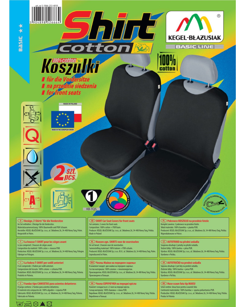A COTTON pólós huzatok magas minőségű természetes anyagból (100% pamut) készültek, ami a legapróbb részletek gondos kivitelezésével együtt, meg fog felelni a legmagasabb elvárásoknak is. A megfelelő szerkezetüknek köszönhetően, és az újszerű felépítés révén a huzatok nagyon jól igazodnak a kocsi üléseihez, jól tapadnak hozzájuk, az egész anyag belső oldalán való PUR hab lamináció megakadályozza azt, hogy elcsússzanak a felületen. Letakarják a fotel/dívány egész használati területét, minek köszönhetően jól védik a károktól és a szennyeződésektől. Nem takarják le a fotelek oldalait, ennek köszönhetően biztonságosan használhatók az Air Bag légpárnákkal rendelkező fotelek esetén. A huzatok védenek, és ugyanakkor nagyon látható módon változtatják meg a fotelek kinézetét, a belső térnek egyedülálló karaktert biztosítva. A SHIRT COTTON huzatok megfelelnek az összes használati szabványnak, mivel nagyon jól védik a kocsi eredeti kárpitját a kopástól, a károktól, a szennyeződéstől.