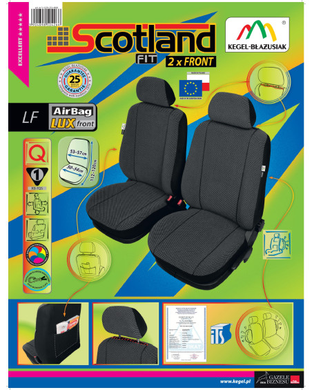 A SCOTLAND huzatok a használóik számára biztonságot és komfortos használatot biztosítanak. A legmagasabb minőségű, erős, nehezen lángra kapó anyagból készültek, különleges esztétikai benyomást keltenek, ugyanakkor védik a kocsi kárpitját a károsodástól és a szennyeződésektől. A kárpitanyag, melyből a huzatok készültek, megfelel a legmagasabb tartóssági normáknak – erős, tartós és nehezen kap lángra. A színei sötétek, visszafogottak, nagyon jól néznek ki mindegyik kocsi belsejében. Az ízléses, fehér minta a fekete anyagot elegánssá teszi. A modern konstrukció és a méretezés miatt a huzatok jól igazodnak az adott modellekhez, és a PUR habbal való laminálásnak köszönhetően nagyon jól tapadnak. Gazdagítsa a kocsi belső terét a legmagasabb minőségű termékkel! Már most gondoskodjon a kocsi belsejéről! A 25 hónapra szóló garanciának köszönhetően biztos lehet abban, hogy a legmagasabb minőségű terméket vásárolja.