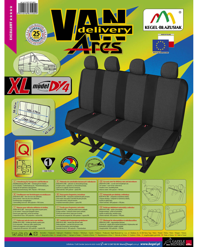 Az ARES huzatok – kényelmesek és biztonságos autóhuzatok, melyeket a szállítással foglalkozó kocsik és kisbuszok tulajdonosaira gondolván terveztünk meg – szakszerű kivitelezésűek, lángra nehezen kapható, magas minőségű jaquard szövetből készültek. Pontosan ilyen szövetből készülnek a kocsigyáraknak előállított fotelkárpitok. Gondos, pontos kivitelezésűek. A megfelelő szerkezetüknek és a megfelelő méreteknek köszönhetően nagyon jól illenek a konkrét kocsik üléseihez. Mivel a belső oldalukat PUR habbal lamináltunk, pontosan illeszkednek a fotelekhez. Az ARES huzatok jól védik a kárpitot az elhasználódástól, kosztól és károktól, valamint nagyon jól néznek ki a kocsi belsejében. A huzatok teljes egészében nagyon erős, tartós és vastag jaquard szövetből készültek. Az anyag fekete színű – a fekete szín és az elegáns szürke színű minta tökéletesen illik minden kocsi belső teréhez. A 25 hónapra szóló garanciának köszönhetően biztos lehet abban, hogy a legmagasabb minőségű terméket vásárolja.
