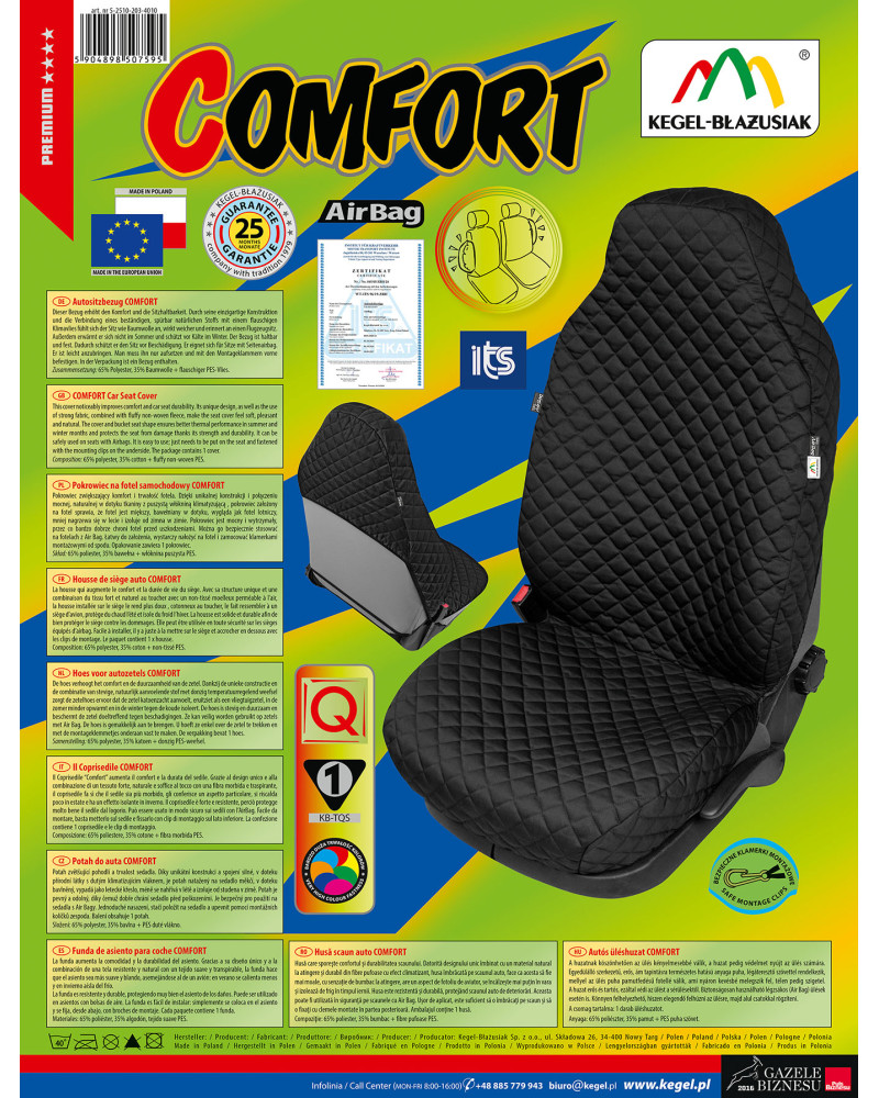 A COMFORT huzat egy kivételes ötvözete a természetes pamutnak és a bolyhos klimatizáló szövetnek, ami miatt a huzat tényleg vastag, puha és rugalmas. A használója kényelmesen használhatja, minek köszönhetően az utazás sokkal kellemesebb. Az anyag magas, majdnem 100%-os színmegtartással rendelkezik, nehezen színeződik el, kopik, fakul. Erős, tartós és ugyanakkor nagyon finom tapintású, mintha tiszta pamutból készült volna. A huzat nagyon jó szigetelést biztosít – nyáron nehezen melegszik fel, télen szigetel. A COMFORT huzat jól védi a fotelt a sérülésektől és koszolódástól. A huzat nagyon jól tölti be a védelmi funkcióját, mivel az egész fotelt befedi az oldalait és a fejtámláit is. A fejtámlát védő rész az egész huzathoz kapcsolódik, ezek miatt miután felhúzzuk, nagyon jól néz ki, és egy repülő ülésére emlékeztet. A biztonságot garantálja, mivel alkalmazható az AirBag típusú oldalsó légpárnákkal rendelkező fotelek esetében is. Alkalmazható a sofőr ülésén és az utas ülésén is, mivel a biztonságos varrat, mely kinyílik, amikor az AirBag légpárnák működésbe lépnek, egyaránt megtalálható a bal és a jobb oldalon is. A huzat univerzális méretben készült, ennek köszönhetően a sztenderd autós ülések többségére jó. A termék nagyon könnyen szerelhető és tiszítható.