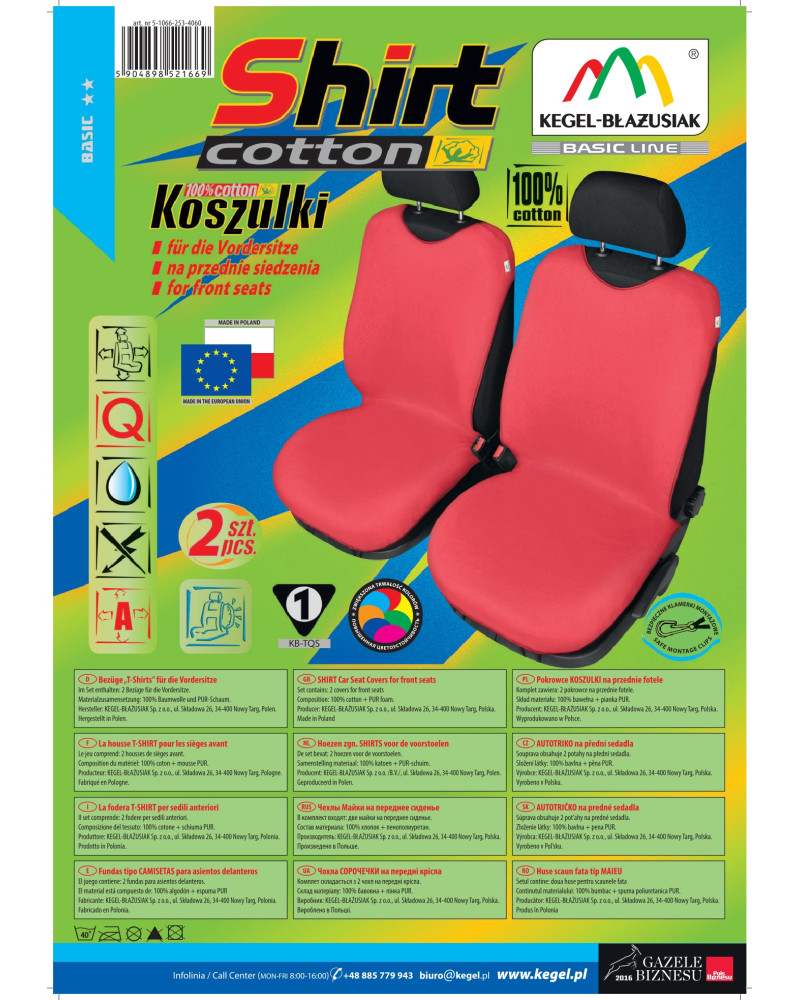 A COTTON pólós huzatok magas minőségű természetes anyagból (100% pamut) készültek, ami a legapróbb részletek gondos kivitelezésével együtt, meg fog felelni a legmagasabb elvárásoknak is. A megfelelő szerkezetüknek köszönhetően, és az újszerű felépítés révén a huzatok nagyon jól igazodnak a kocsi üléseihez, jól tapadnak hozzájuk, az egész anyag belső oldalán való PUR hab lamináció megakadályozza azt, hogy elcsússzanak a felületen. Letakarják a fotel/dívány egész használati területét, minek köszönhetően jól védik a károktól és a szennyeződésektől. Nem takarják le a fotelek oldalait, ennek köszönhetően biztonságosan használhatók az Air Bag légpárnákkal rendelkező fotelek esetén. A huzatok védenek, és ugyanakkor nagyon látható módon változtatják meg a fotelek kinézetét, a belső térnek egyedülálló karaktert biztosítva. A SHIRT COTTON huzatok megfelelnek az összes használati szabványnak, mivel nagyon jól védik a kocsi eredeti kárpitját a kopástól, a károktól, a szennyeződéstől.