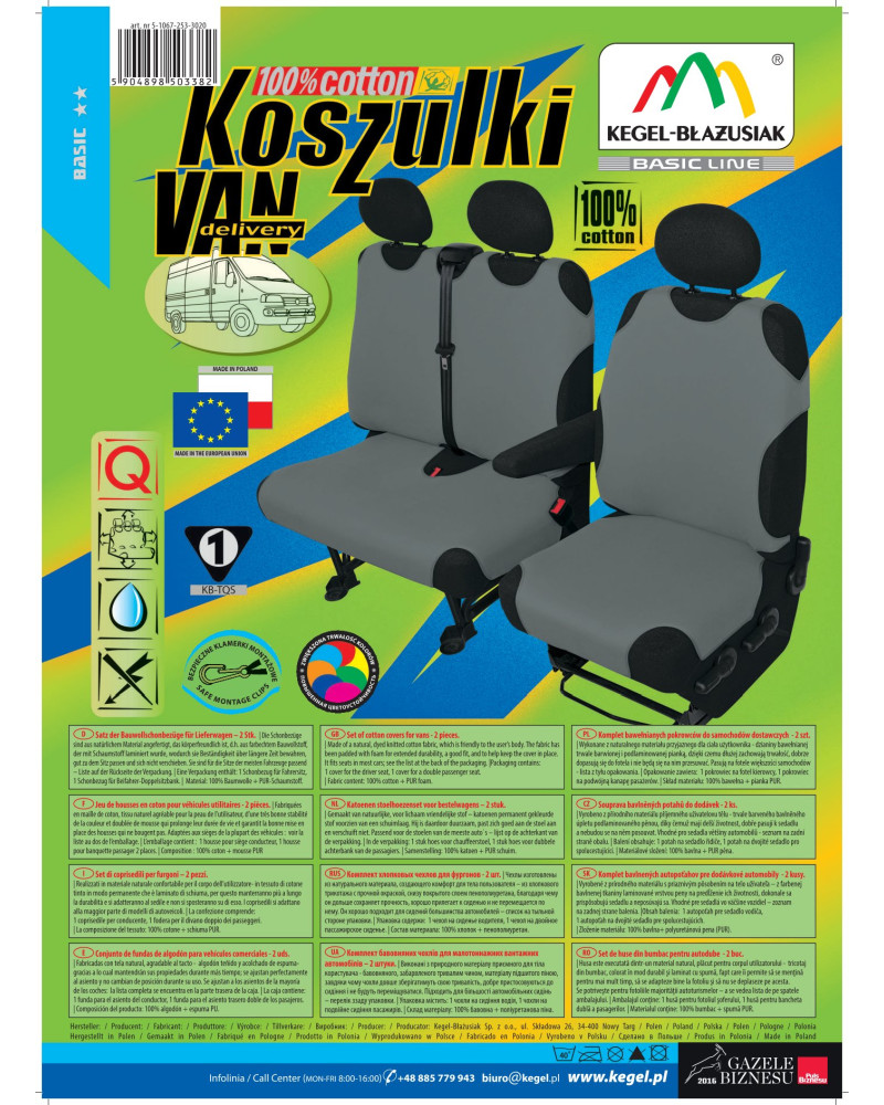 A COTTON DV (Delivery Van) pólós huzatpk univerzális huzatok a szállítókocsik számára, melyek 100%-os pamutból készültek – magas minőségű, természetes anyagból. Szakszerű kivitelezés, a részletekre való odafigyelés és a kifogástalan kinézet meg fog felelni a legmagasabb elvárásoknak is. A megfelelő felépítés miatt a huzatok nagyon jól tapadnak az ülésekhez, a belső oldalon való PUR habbal laminálás pedig meggátolja az elcsúszást. A huzatok szinte valamennyi autóüléshez illeszkednek. Nagyon könnyű feltenni és levenni őket. Nagyon könnyű tisztítani. A huzatokat készletekben értékesítjük – a készletben van egy huzat a fotelre és egy a kétszemélyes díványra. Külön meg lehet venni a fejtámlákra való huzatokat. A pólós huzatok évek óta nagy népszerűségnek örvendenek az ügyfeleink között. Védik, ugyanakkor jól látható módon megváltoztatják a fotelek kinézetét, karakteressé teszik az autót.