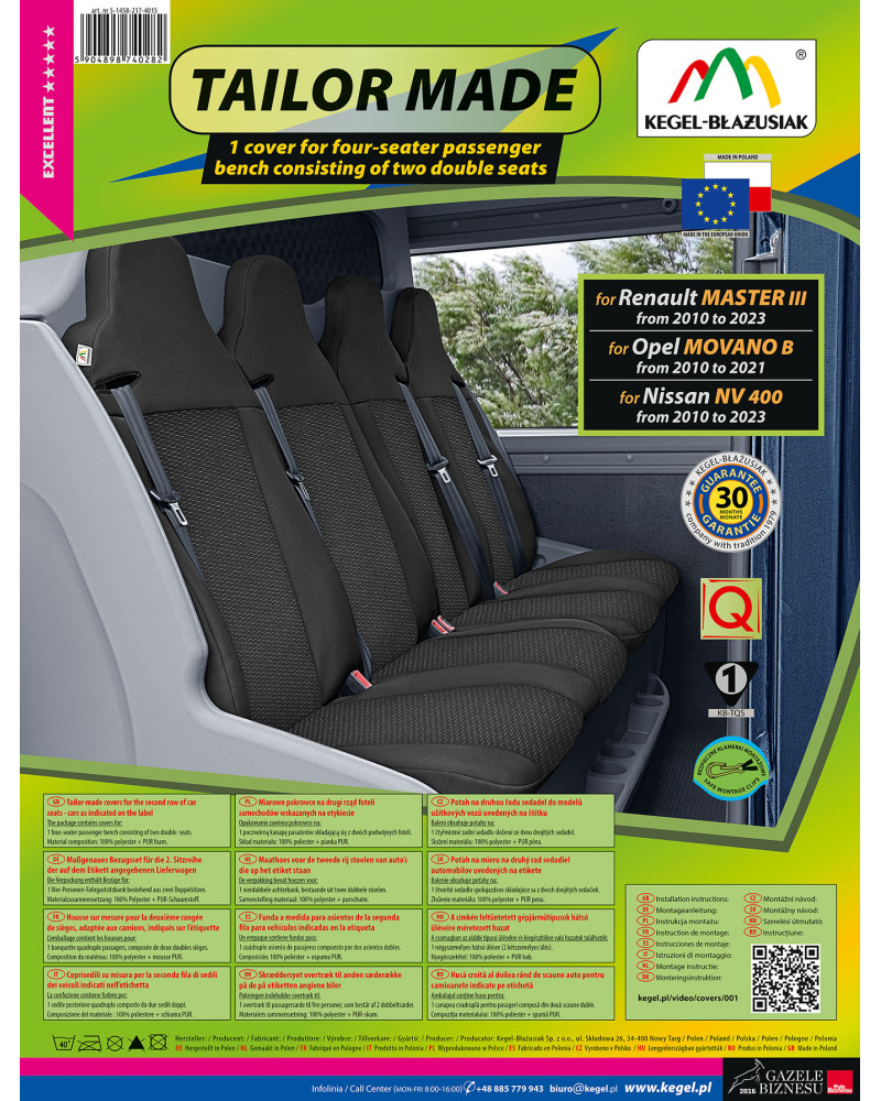 Az elülső ülésekre és a hátsó díványra való huzatokat külön csomagolásban adjuk el. Azonban az egész készlet is megvehető. Önöké a választás. Ennek köszönhetően kiválaszthatják, hogy egyből megveszik az egész készletet vagy csak az elülső/hátsó ülésekre való huzatokat, attól függően, mit szeretnének jobban. Mivel a gyártást egészében ismételjük, bármikor összeállíthatja a készletet, és nem kell attól félnie, hogy az egyes gyártási sorok különböző színűek lesznek, illetve különböző anyagok felhasználásával készülnek.