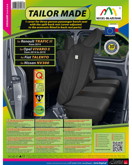1 háromszemélyes osztott háttámlájú ülés (a háttámlahuzat a háttámla oldalainál lévő könyöktartókhoz méretezett)