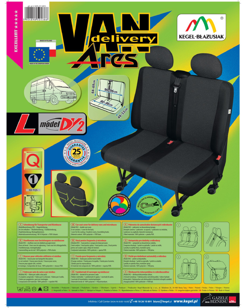 Az ARES TAILOR MADE huzatok – kényelmesek és biztonságos autóhuzatok, melyeket a szállítással foglalkozó kocsik és kisbuszok tulajdonosaira gondolván terveztünk meg – szakszerű kivitelezésűek, lángra nehezen kapható, magas minőségű jaquard szövetből készültek. Pontosan ilyen szövetből készülnek a kocsigyáraknak előállított fotelkárpitok. Gondos, pontos kivitelezésűek. A megfelelő szerkezetüknek és a megfelelő méreteknek köszönhetően nagyon jól illenek a konkrét kocsik üléseihez. Mivel a belső oldalukat PUR habbal lamináltunk, pontosan illeszkednek a fotelekhez. Az ARES huzatok jól védik a kárpitot az elhasználódástól, kosztól és károktól, valamint nagyon jól néznek ki a kocsi belsejében. A huzatok teljes egészében nagyon erős, tartós és vastag jaquard szövetből készültek. Az anyag fekete színű – a fekete szín és az elegáns szürke színű minta tökéletesen illik minden kocsi belső teréhez. A 25 hónapra szóló garanciának köszönhetően biztos lehet abban, hogy a legmagasabb minőségű terméket vásárolja.