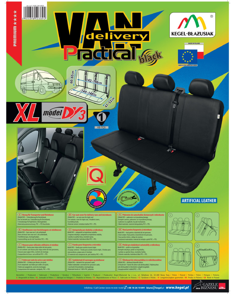 A PRACTICAL méretezett huzat kivételesen tartós, újgerenációs műbőrből készült, ami a legapróbb részletek gondos kivitelezésével az ügyfelek legmagasabb elvárásainak felel meg. A megfelelően felhúzott huzatokat alig lehet elkülöníteni az eredeti, bőrből készült kárpittól, az eredmény pedig nagyon alacsony áron elérhető. A huzat erős, tartós anyagból készült, a megfelelő keretnek köszönhetően jól igazodik az ülésekhez, és jól tapad hozzájuk, így elkerülhető a huzat elcsúszása. A RACTICAL autóhuzatok nagyon jól védik az eredeti kárpitot a koszolódástól és a kopástól, az ízléses , modern stílus pedig pozitív esztétikai benyomást kelt. A huzatot nagyon könnyű tiszítani és feltenni. Alapos kivitelezés garantálja a magas minőséget és a hosszú ideig tartó használatot. A vízhatlan, nem koszolódó és kivételesen tartós anyag biztosítja a praktikus használatot. Az ajánlatunk a szállításra használt kocsik és kisbuszok részére készült, azon vezetők számára, akik szeretnék megvédeni a kocsik belsejét, és elegánsabbá is tennék azt. A fekete, univerzális színek tökéletesen igazodnak a kocsik belsejéhez. A huzatok nagyon jól néznek ki mindegyik kocsi belsejében. Kivételesen elegánsak, ezért használatukkal minden belső tér elegánsabbá válik.