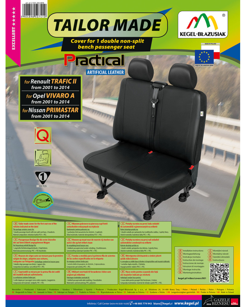A PRACTICAL méretezett huzat kivételesen tartós, újgerenációs műbőrből készült, ami a legapróbb részletek gondos kivitelezésével az ügyfelek legmagasabb elvárásainak felel meg. A megfelelően felhúzott huzatokat alig lehet elkülöníteni az eredeti, bőrből készült kárpittól, az eredmény pedig nagyon alacsony áron elérhető. A huzat erős, tartós anyagból készült, a megfelelő keretnek köszönhetően jól igazodik az ülésekhez, és jól tapad hozzájuk, így elkerülhető a huzat elcsúszása. A RACTICAL autóhuzatok nagyon jól védik az eredeti kárpitot a koszolódástól és a kopástól, az ízléses , modern stílus pedig pozitív esztétikai benyomást kelt. A huzatot nagyon könnyű tiszítani és feltenni. Alapos kivitelezés garantálja a magas minőséget és a hosszú ideig tartó használatot. A vízhatlan, nem koszolódó és kivételesen tartós anyag biztosítja a praktikus használatot. Az ajánlatunk a szállításra használt kocsik és kisbuszok részére készült, azon vezetők számára, akik szeretnék megvédeni a kocsik belsejét, és elegánsabbá is tennék azt. A fekete, univerzális színek tökéletesen igazodnak a kocsik belsejéhez. A huzatok nagyon jól néznek ki mindegyik kocsi belsejében. Kivételesen elegánsak, ezért használatukkal minden belső tér elegánsabbá válik.
